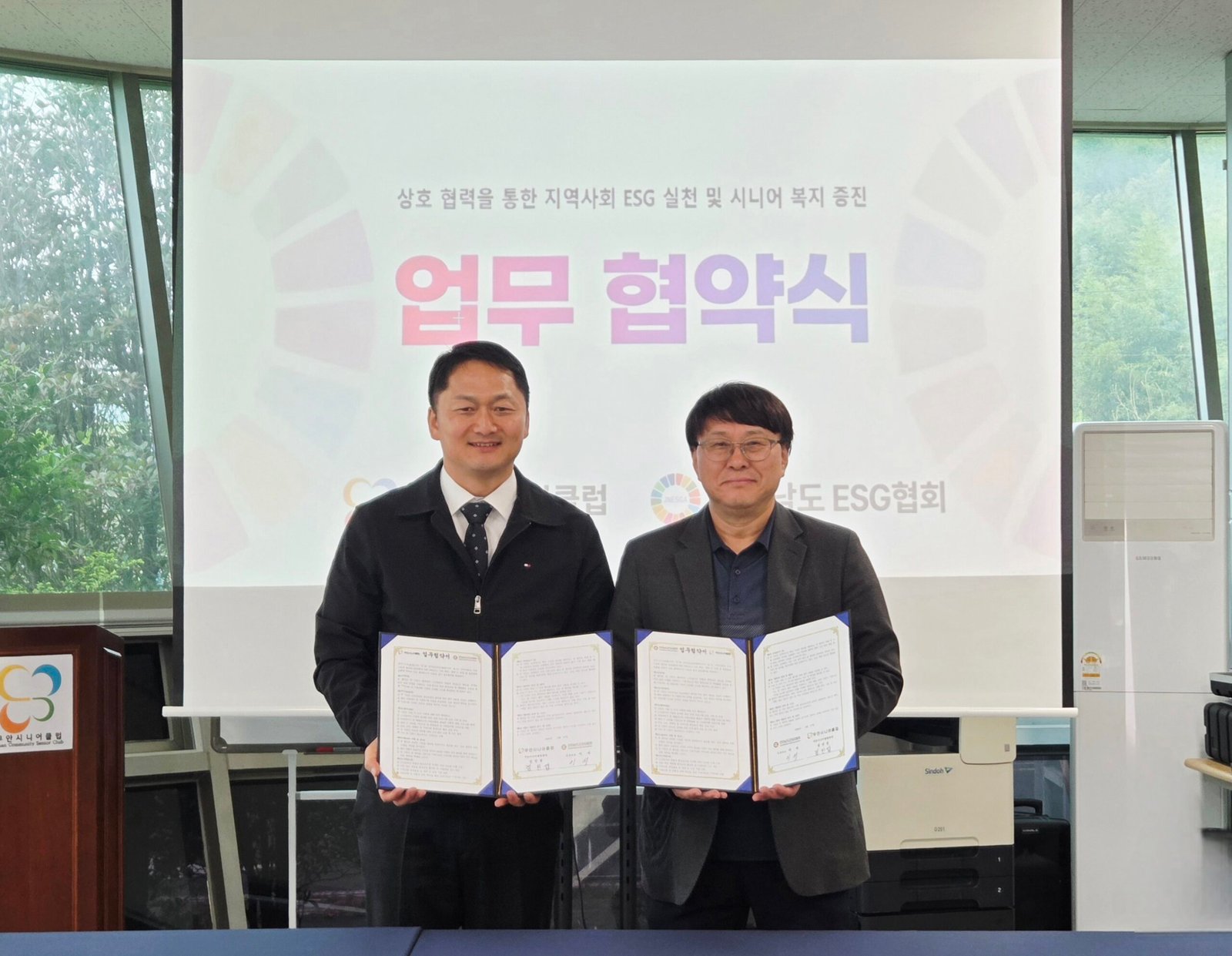 무안시니어클럽(관장 김민섭)과 전라남도 ESG협회(공동대표 이서)는 17일 무안시니어클럽에서 상호 협력을 위한 업무협약(MOU)을 체결하고, ESG(환경·사회·지배구조) 가치 확산과 세대 간 상생 및 통합돌봄 실현에 힘을 모으기로 했다.